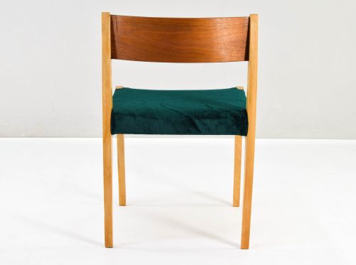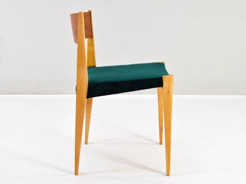 This set of four chairs has the peculiarity of having a teak backrest and beech legs.